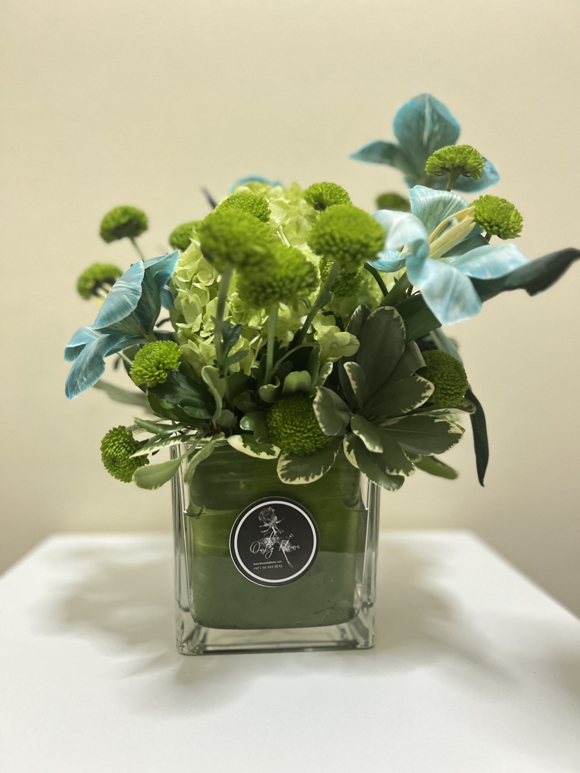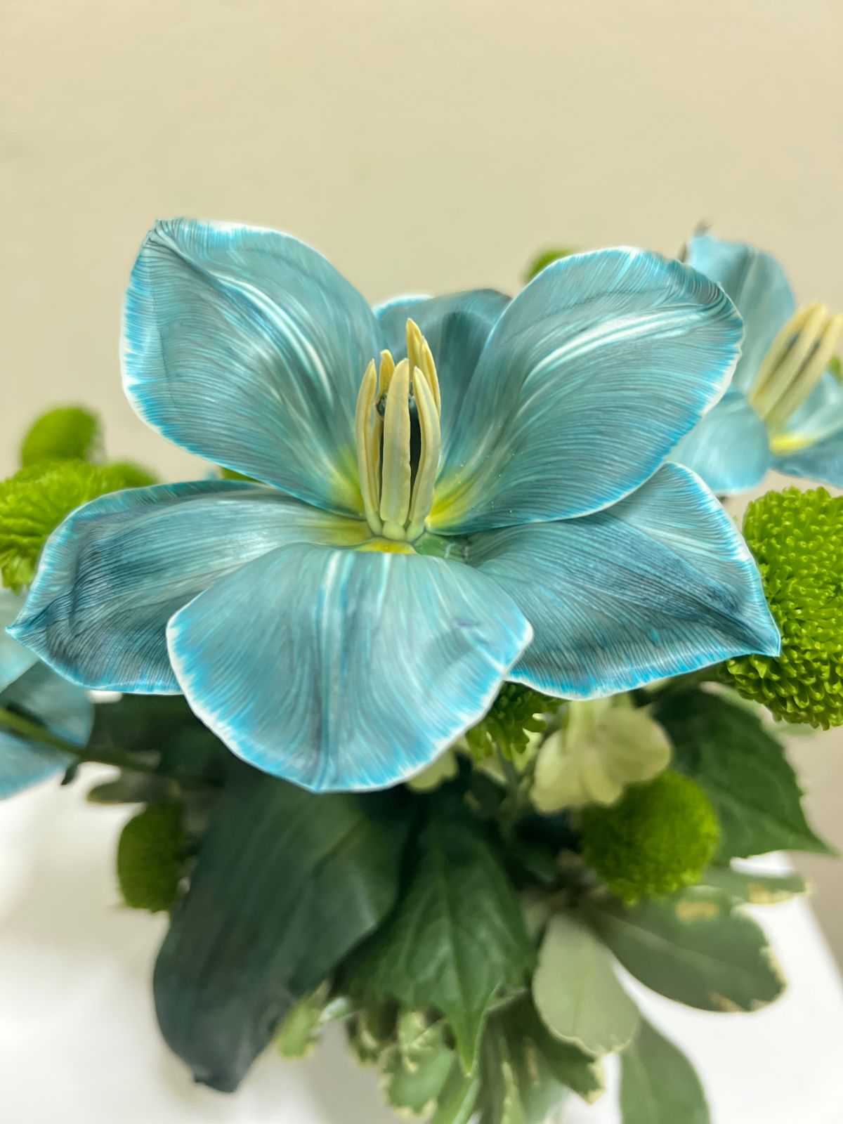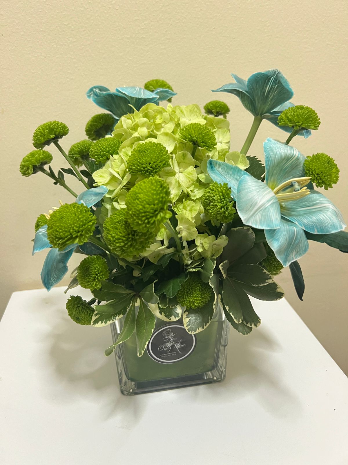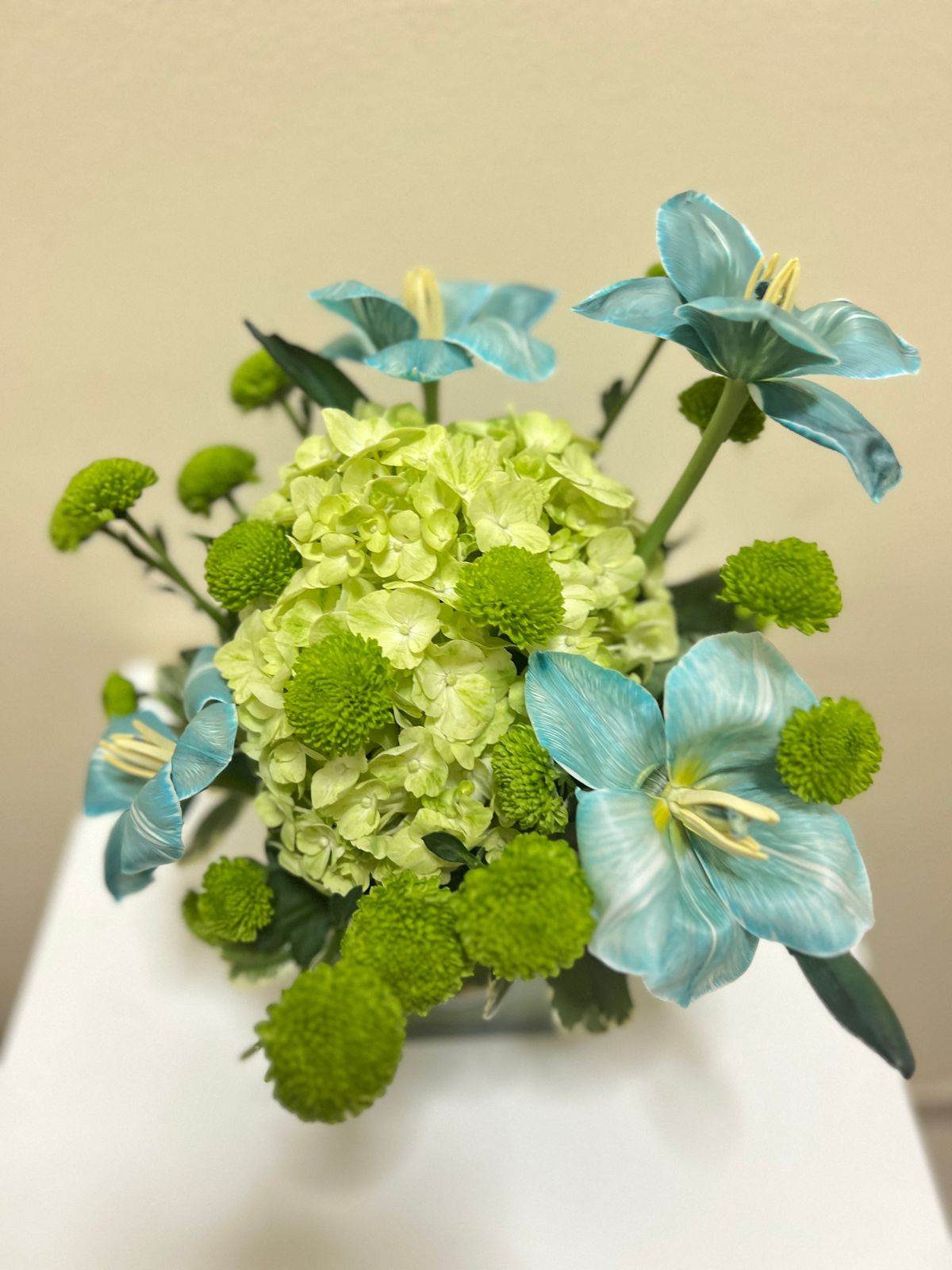 Mixed of Blue Tulip, Green Chrysanthemum Buttons & Green Hydrangea Flower with Seasonal Greeneries Centerpiece